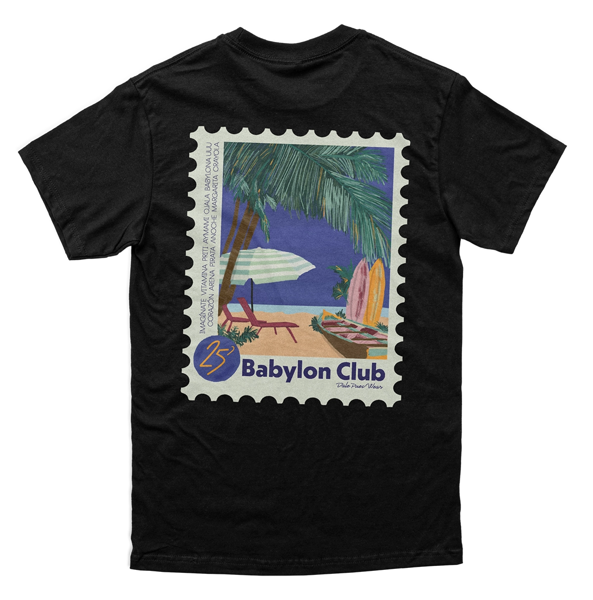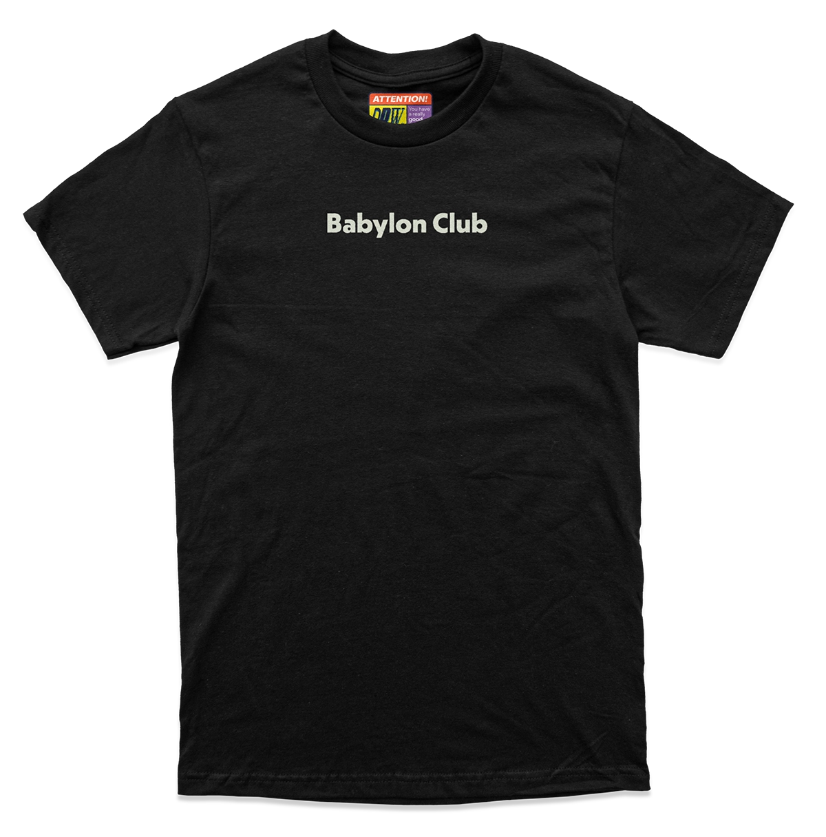 Babylon Club t-shirt, inspired by Danny Ocean’s Babylon Club album🔥 Printed on a black tee with minimal front logo and postage stamp-inspired illustration on the back, both made in DTF.