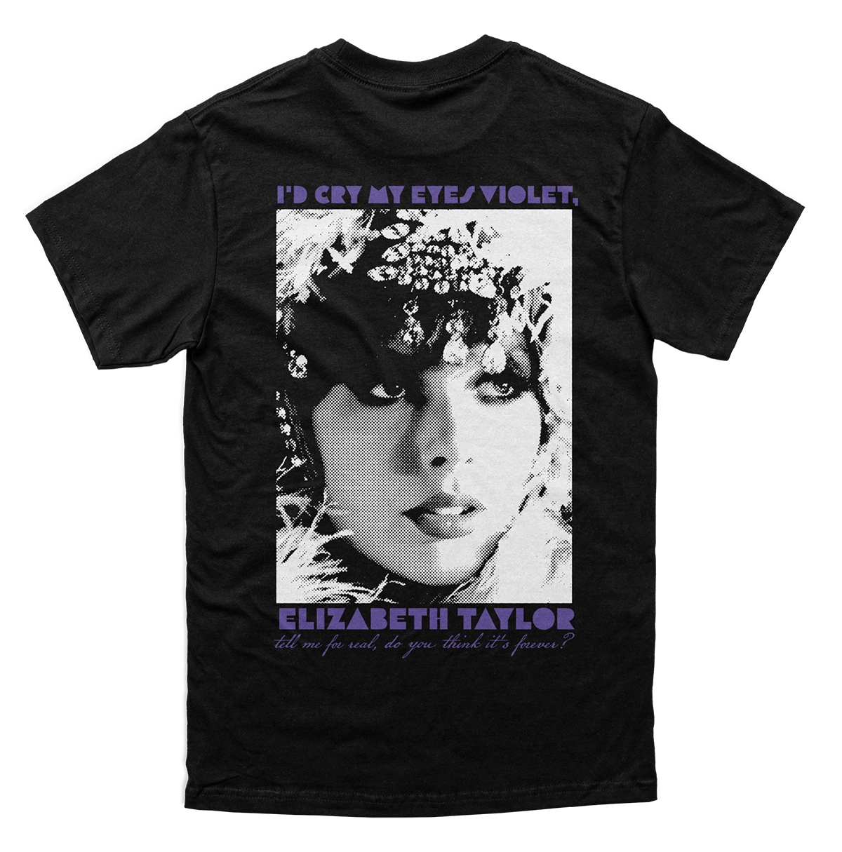 Elizabeth t-shirt, inspired by Taylor’s song “Elizabeth Taylor.” Printed on a classic black tee with white and purple DTF print front and back.